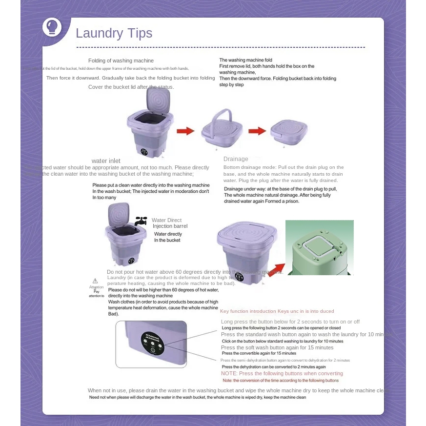 Good mini washing machine.Perform well Wash and spin dry ok!