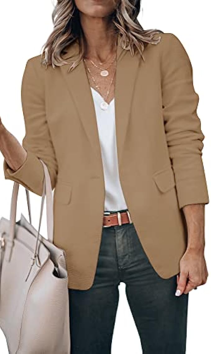 Polyester,Spandex Polyester lining Button closure Line Dry Material: Polyester&Spandex. Soft fabric. This jacket comes with a full lining. Soft and Comfortable to Wear Features: Basic lapel collar blazer jacket for women, a single front button design, two functional flap pockets, perfectly carrying some necessity, or nailing a chic look. Occasion: Suitable for casual street look, business outfit, work office style, leisure time, daily life, holiday, vacation and so on.