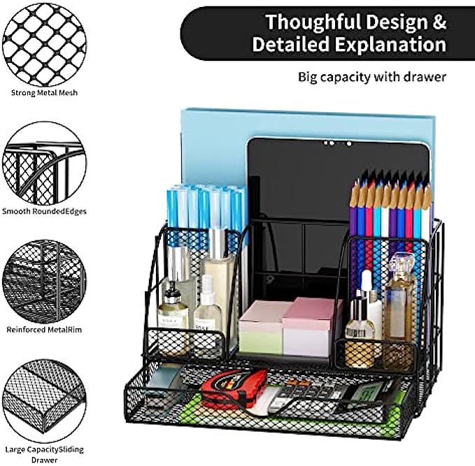 • 【Desk Pen Organizer Sturdy Durable】: Desk caddy is made of high quality metal, adopting with a powder coat finish and electroplating technology, wear-resistant, anti-oxidation, long lasting and does not fade, desktop organizer and Accessories the extremely smooth edges, will not hurt your things or yourself, and protect your desk.