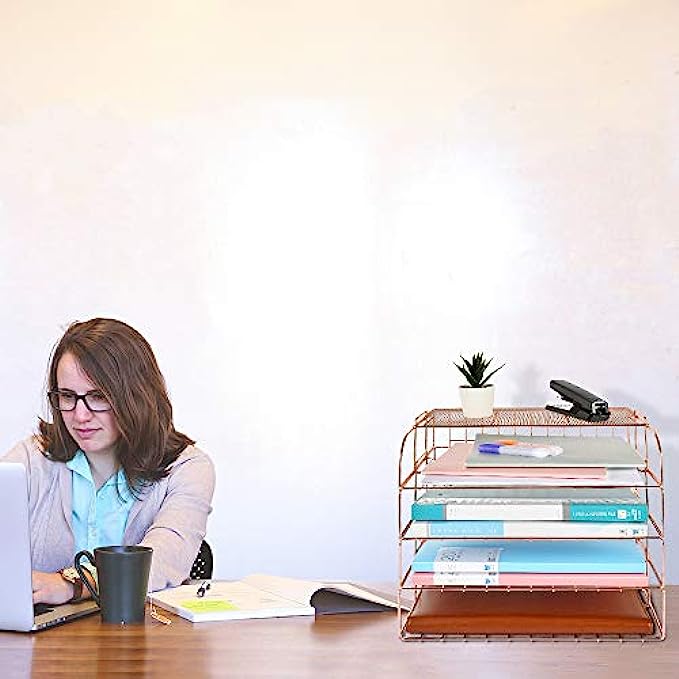 Spacrea Letter Tray, 4 Tier Rose Gold Desk Organizers and Accessories for Women, Stackable Paper Tray Organizer Desk File Organizer with 1 Upper Display Shelf (Rose Gold)
