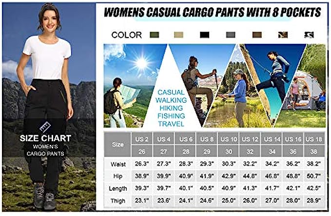 • Cargo Pants for Women: Alfiudad tactical performance cargo pants features 8 pockets which is stylish and functional to help free your hands during activities/The left front zipper pocket is for decorative use. Hand/Machine washing in cold water, do not bleach, hang dry is preferred. Belts need to be purchased seperately.