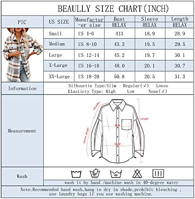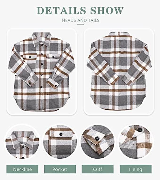 Flannel Button closure [Material]-The long sleeve shirt made with high quality flannel. The flannel fabric is thick, wear-resistant, and has good warmth retention.soft to the touch and comfortable to wear.best for autumn and winter. [Feature]-The flannel shirt,Button front top,Collared,Plaid print,Two flap chest pocket,Single button on cuff,Oversized fit,Drop shoulder,Unlined. [Plaid Shirt for Women]-So versatile is our flannel button down pocket top that can be worn open as a jacket or closed as a top! It can be tied at the waist or wrapped around waist, wear as 3/4 sleeves or full sleeve. [Oversized Flannel Shirt]-This long sleeve shacket jacket is featured with plaid print, shacket, button down, soft fabric, oversized, loose fitting, casual style,great to match with basic T-shirt, crop top, leggings, jeans, bodycon dress, sneakers or high heels for casual look that's easy to love all season long. [Occasion] -The fashion button down blouses is perfect choice for your daily wear, outdoor activities, shopping,Vacation, Travel, Hang out,club, party, dates.Package content: 1 X women's blouses.