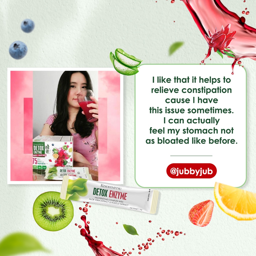 My stomach always feel hard to digest, bloated, plus long term constipation. Recently thanks to shopee farm I got a kinohimtsu voucher so bought the detox enzyme 3 sachets a pack to test try. After consumed 1 sachet, around 2 hrs later I did my business fast and smoothly in toilet (that day only went once). I can felt the inner of my big hard stomach became softer. After having my meal it became a bit harden back. Of course I knew still need to eat moderate, correct foods, plus one week at least 2.5 hours of exercise to loss weight and maintain it. Detox enzyme is just a supplement help me to relieve and aid in loss weight faster a bit than normal. Drink tasted like berry, nice. Promotion comes with a free small box of 5Dtox which inside got 8 sachets. Also taste like berry.