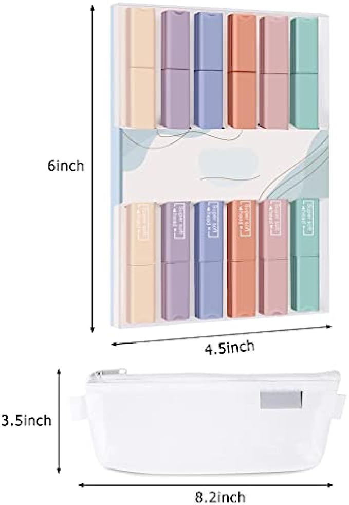 • ? Package - You will get 6 pcs cute highlighters with plastic box and 1 clear mesh pen bag. Important, you can use our pencil case to hold the aesthetic highlighters or other school supplies, light weight & space saving, easy to carry.