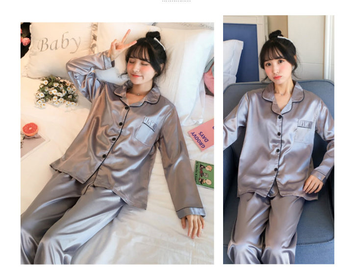 Ready Stock Plus Size M-5XL pajamas Suit Satin Long Sleeve pyjamas Baju Tidur Silk Sleepwear 2-piece set