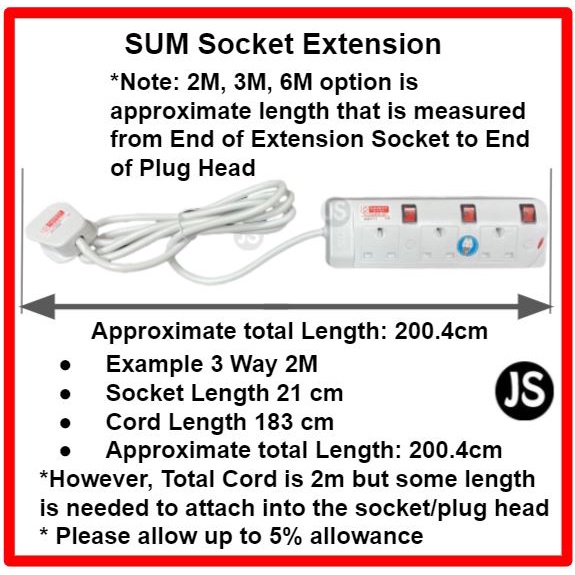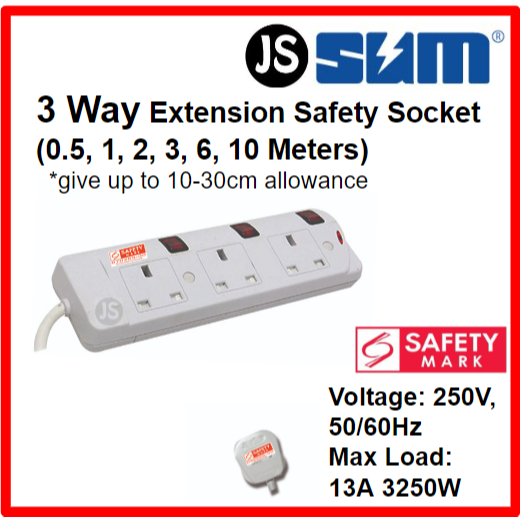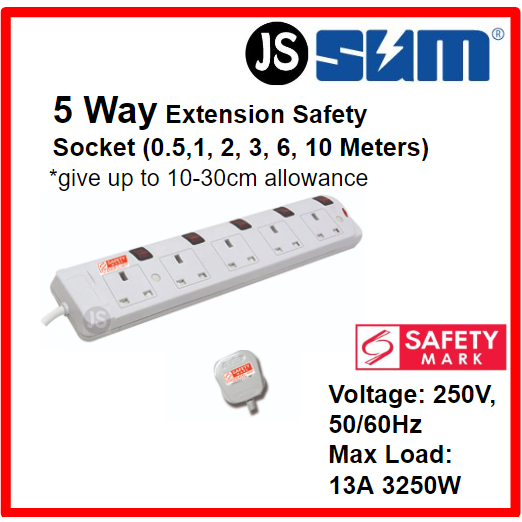 SUM 2/3/4/5 WAY Extension Socket (0.5, 1, 2, 3, 6, 10 Meters) With Singapore Safety Mark